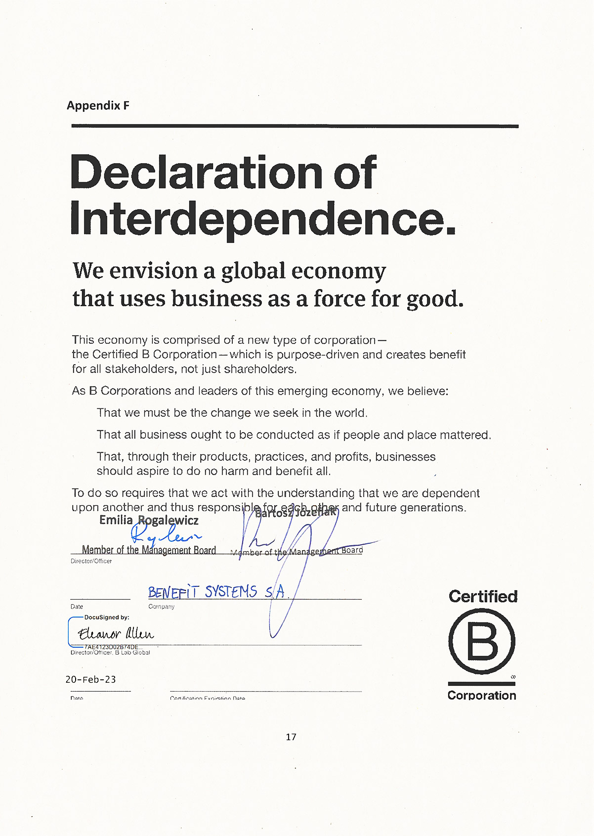 Benefit Systems jest pierwszą i jak dotąd jedyną spółką giełdową w Polsce, która po tym, jak dołączyła do ruchu B Corp w 2018 r., w 2023 r. odnowiła certyfikację. Recertyfikacja to potwierdzenie, że dojrzałe podejście do zagadnień ESG, podejmowanych przez Benefit Systems od lat, to właściwy kierunek.